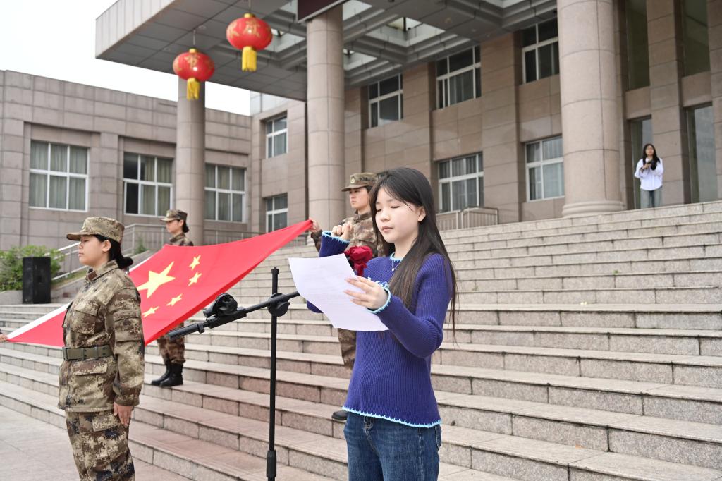 国旗飘扬,誓言铿锵。李若璇同学领誓,全体同学高举右手,庄严进行校园文明宣誓,以青春之名承诺:严守校规校纪、恪守文明公约、爱护校园环境、团结互助奋进,用实际行动争做文明有礼、向上向善的新时代大学生。