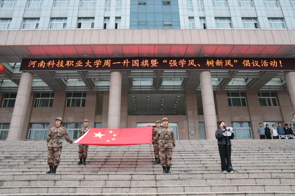 2026 年 4 月 13 日清晨,河南科技职业大学隆重举行周一升国旗暨 “强学风、树新风” 主题倡议活动。校党委委员、学工部部长尚德山,统战部部长、美术与艺术设计学院党委书记刘春华,经济与管理学院党委书记王力伟,保卫处处长郭广才,学生处副处长牛永伟出席活动。保卫处治安科科长马猛主持本次活动。经济与管理学院、美术与艺术设计学院全体在校学生及辅导员参加本次活动。