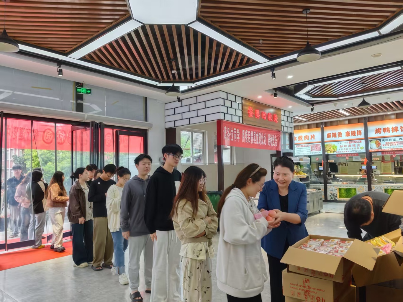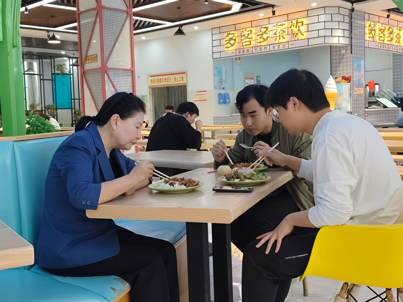 随后,她与学生们围坐在餐桌旁,开启了一场面对面的亲切交流。她主动拉近彼此的距离,热情地和学子们畅谈留校期间的日常。话题从学习的节奏延展到生活中的点滴小事,每一句话都饱含着关切。温馨的氛围在食堂里悄然弥漫开来,不时有轻松的笑声回荡其中。