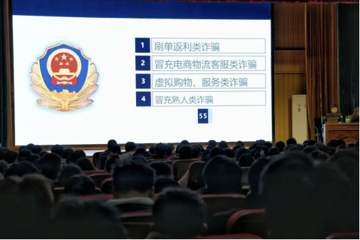 随后,民警为学生们介绍近年来常见的电信网络诈骗发案形式、打击治理成效等内容。通过列举诈骗份子的诈骗套路,列举本地真实案例等加强学生对电信网络诈骗的防范意识。