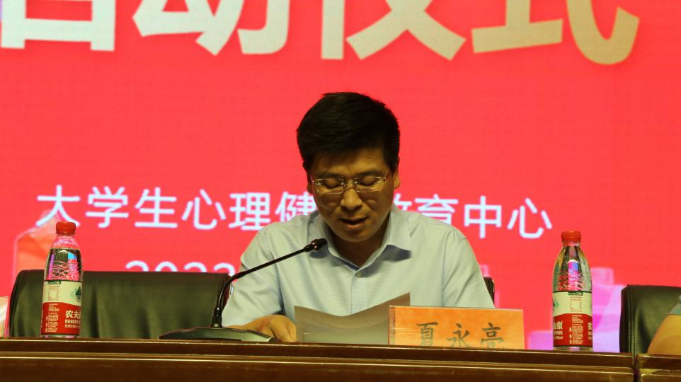 本次活动的主题是“青春力量,逐梦前行”,我校党委副书记夏永亮、党委学工部部长尚德山、医学院院长苑勇出席启动仪式,周口市第六人民医院严重精神障碍管理治疗项目办主任王建刚、周口市第六人民医院科教科科长刘博受邀参加启动仪式,各二级学院心理辅导站相关负责人、全体辅导员及学生代表参加本次活动,启动仪式由大学生心理健康教育中心韩晓燕老师主持。