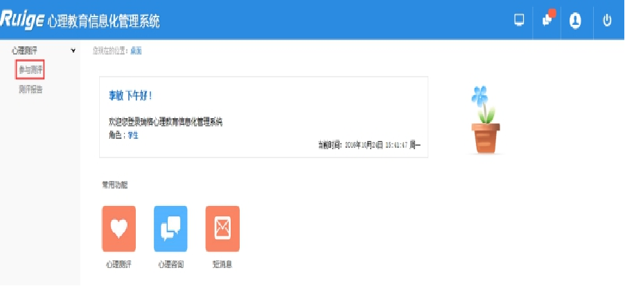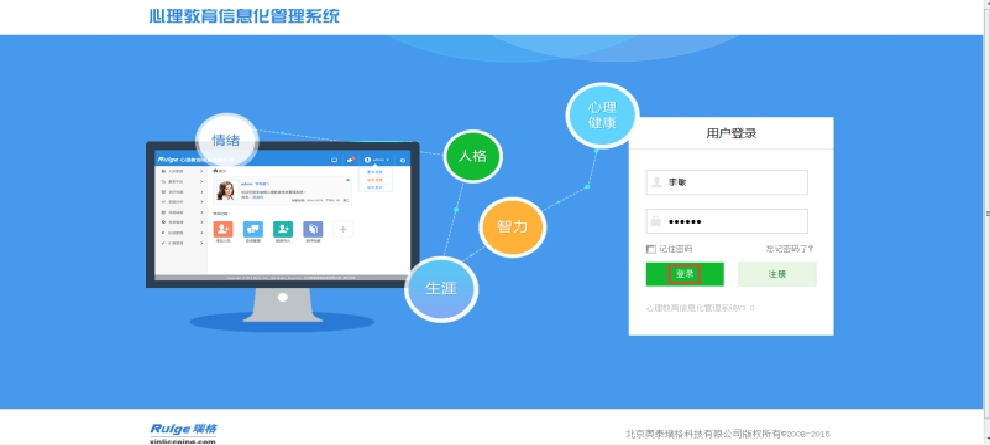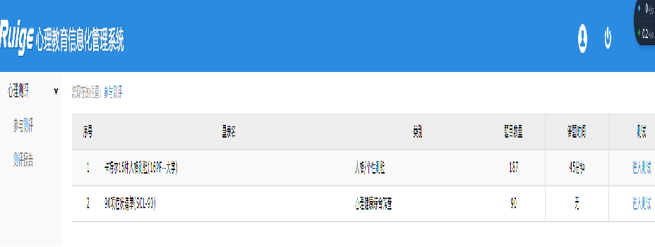 第一步:登录登陆网址:http://192.168.58.16/psym/login/login第二步:进入系统填写账户、密码(用户名和密码均为学生学号),点击【登录】,界面如下: